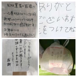 ごみ袋にメッセージをお書きになっていただいている方、直接激励のお声がけいただく方など、収集作業員の大きな励みとなっております。今後も引き続き、感染リスク等に気を付けながら収集業務を続けてまいりますので、ご理解とご協力をよろしくお願いいたします。
